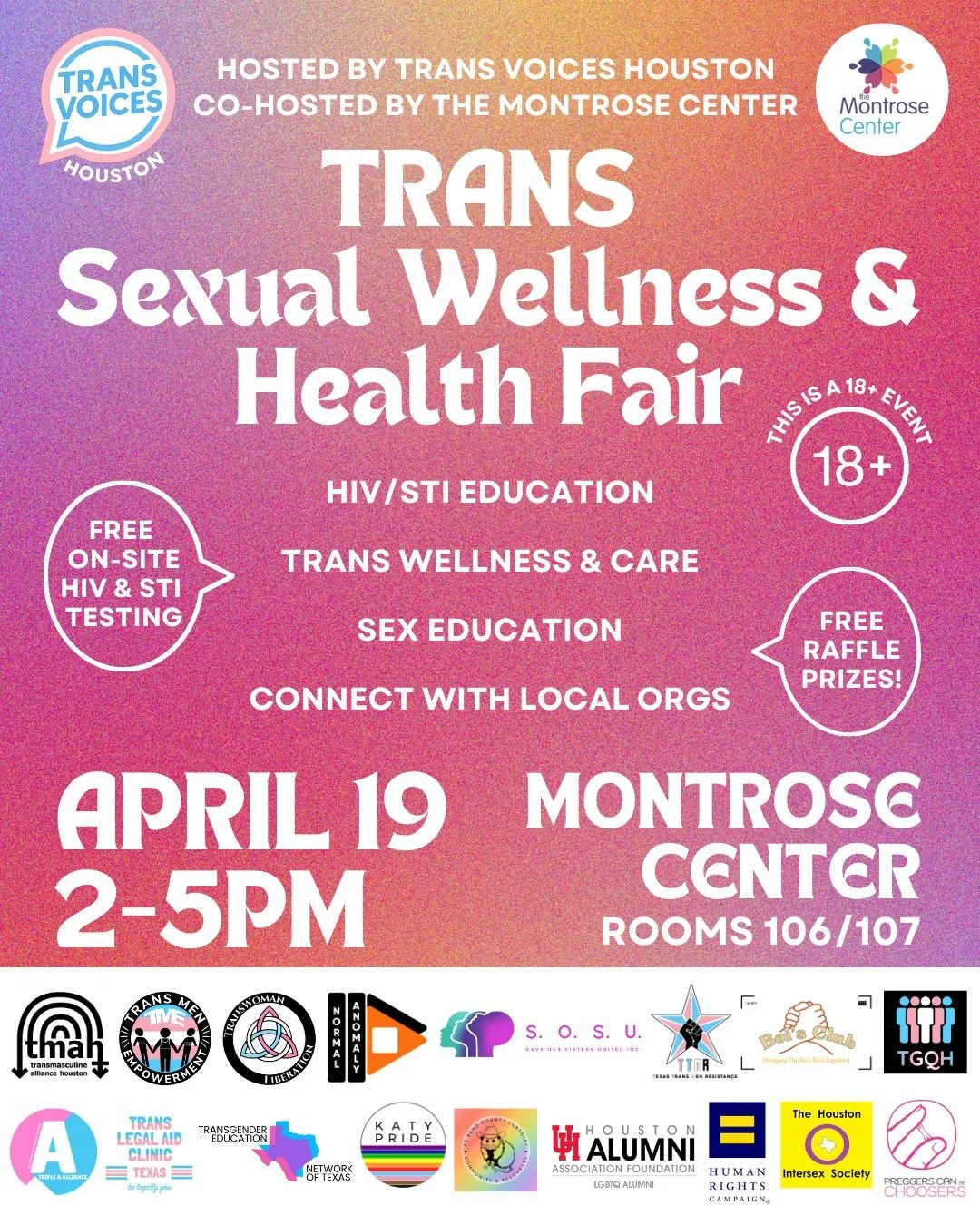 FREE HIV-TESTING & RAFFLE PRIZESWhat to ExpectThe Trans Voices Fair is designed to bring our community together—offering resources, conversation, creativity, and celebration in one shared space. Come as you are. Leave feeling supported, informed, and more connected than when you arrived.